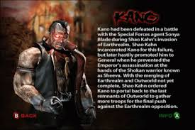 Kano, ao contrário do que muitos pensaram, sobreviveu em Outworld, pois fez um acordo com Shao Kahn - Kano seria intrutor de armas da Terra dos exércitos, para prepará-los para a invasão. Durante a invasão, Kano encontra sua arquiinimgia, Sonya. Os dois lutam no topo de um arranha-céu. Kano ganha vantagem, e arraca um pedaço do cabelo de Sonya, quando ela inesperadamente usa seu famoso agarrão com as pernas, e o arremessa do prédio para a morte certa.